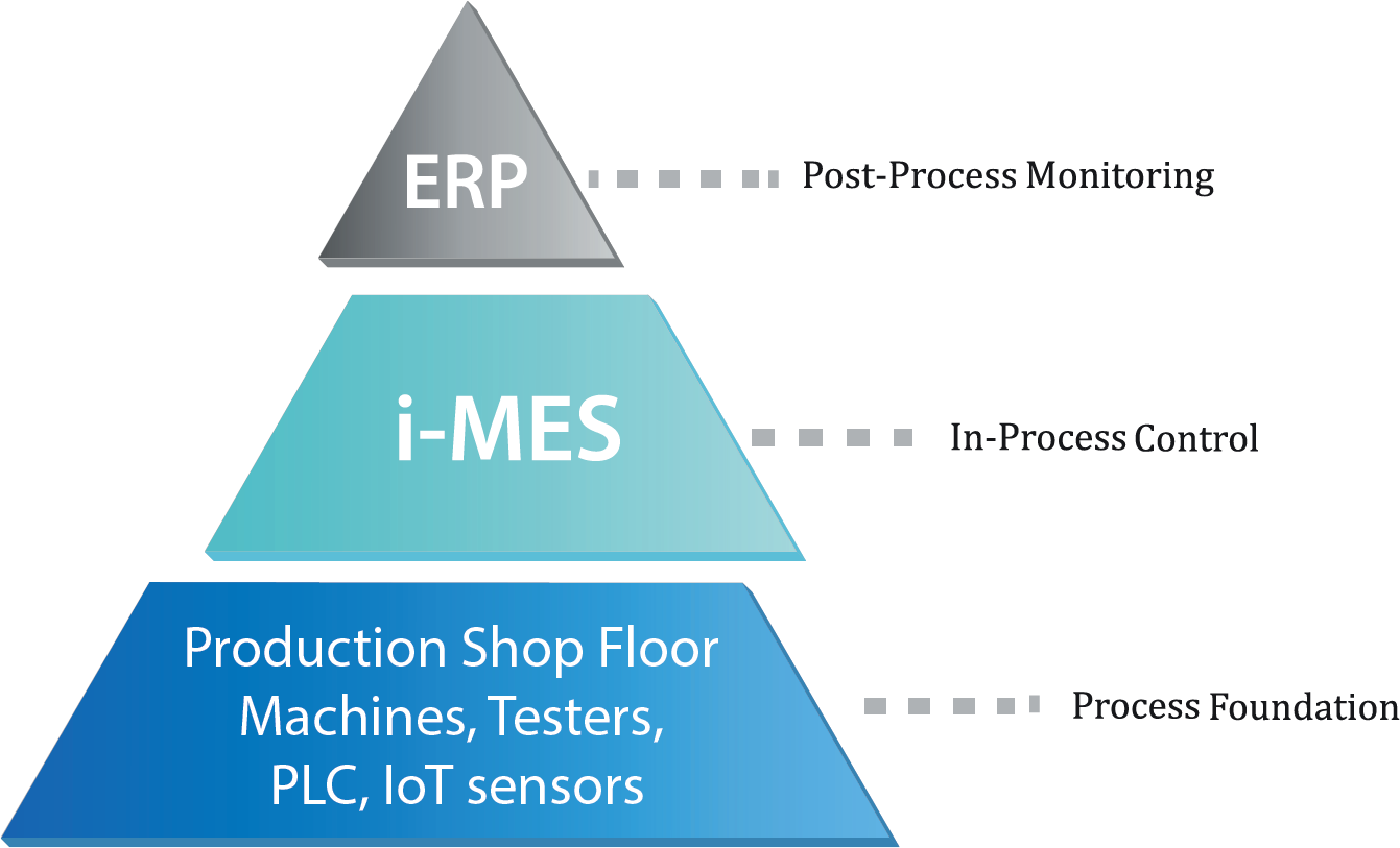 i-MES system bridges the gap between the planning, controlling and execution. It uses on-line information to manage the current application of manufacturing resources: people, equipment and inventory.